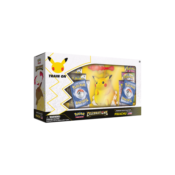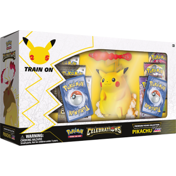 Celebrate Pokémon with Pikachu V and Pikachu VMAX, two takes on one of the best-loved inhabitants of the Pokémon world! This premium collection includes a massive set of Pokémon TCG: Celebrations boosters as well as additional booster packs. Combine all that with an enormous and impressively sculpted commemorative figure of Gigantamax Pikachu, and you have the ultimate Pikachu collection, fully charged up and ready to take on the world!