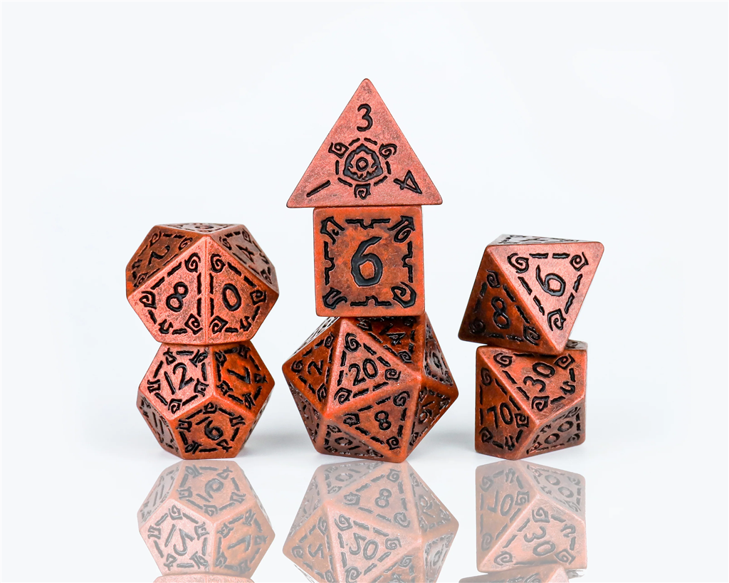 Jedes Set enthält Glyphen und Zahlen im Vintage-Look. Dieses Kupferset besteht aus einem Satz von 7 mehrflächigen Würfeln, die in einer Dose mit Fenster verpackt sind, sodass du deine Würfel leicht transportieren und aufbewahren kannst.